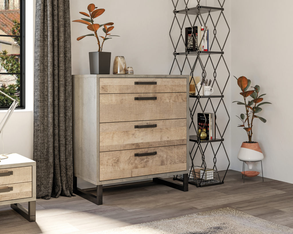 Корпус виконаний в оригінальному декорі «вудкон», що імітує бетон нейтрального світло-сірого відтінка. Фасади виконані з ЛДСП, у теплому декорі «дуб гранж пісочний», що передає м’якість деревини.
