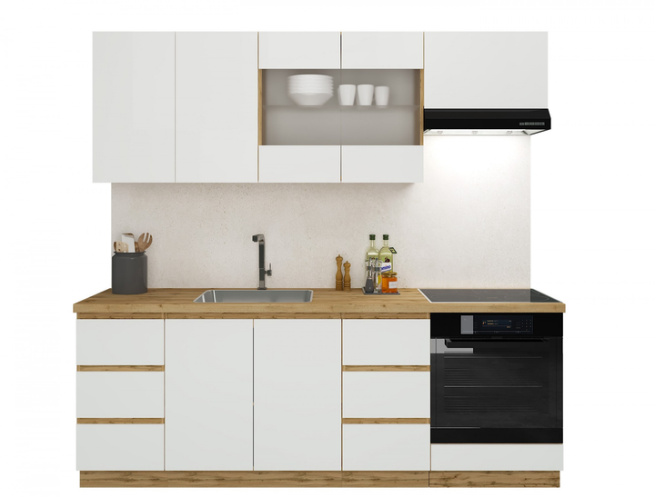 Нижні елементи 40 низ шухляди, 80 низ мийка, 40 низ шухляди, 60 низ духовка.Верхні елементи 40 верх, 40 верх, 80 верх вітрина, 60 верх витяжка.