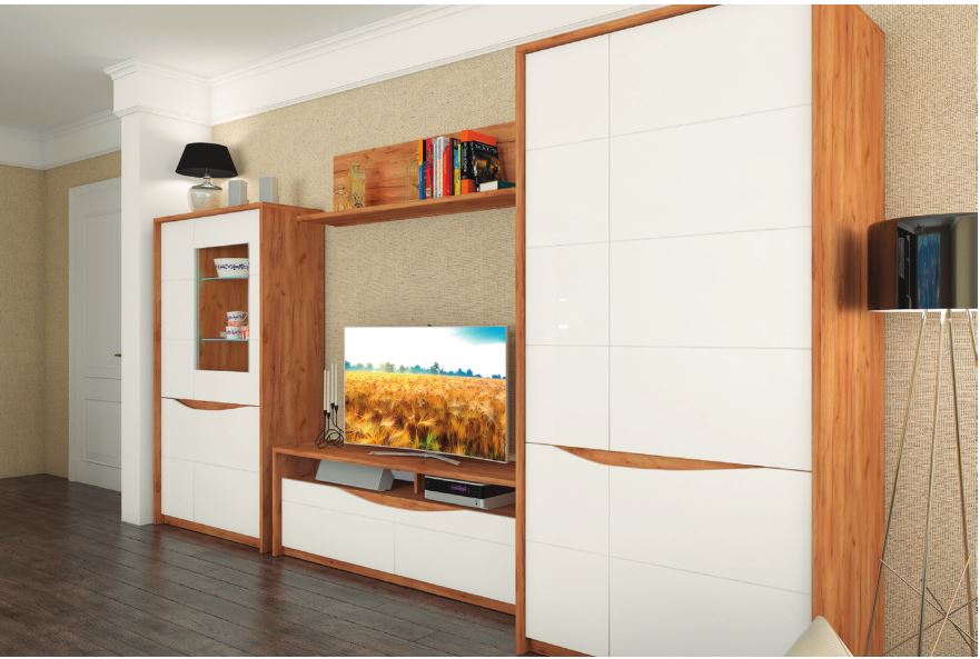 Глянцевий білий колір фасадів у поєднанні з корпусом дуб крафт табако придає кімнаті легку і затишну атмосферу.
