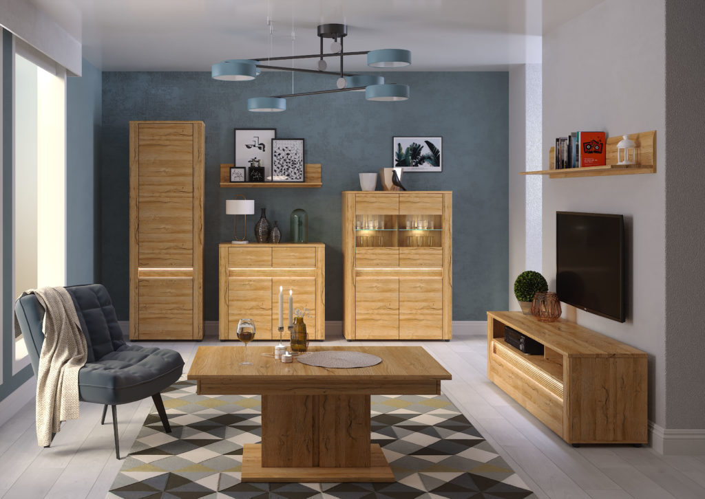 В шухлядах встановлені телескопічні направляючі, на дверцятах – петлі з дотягом. Широкий асортимент незалежних модулів Санді дозволяє легко скомбінувати вітальню в декількох варіантах, а також кабінет, їдальню або передпокій. -
