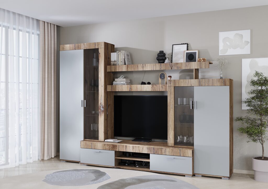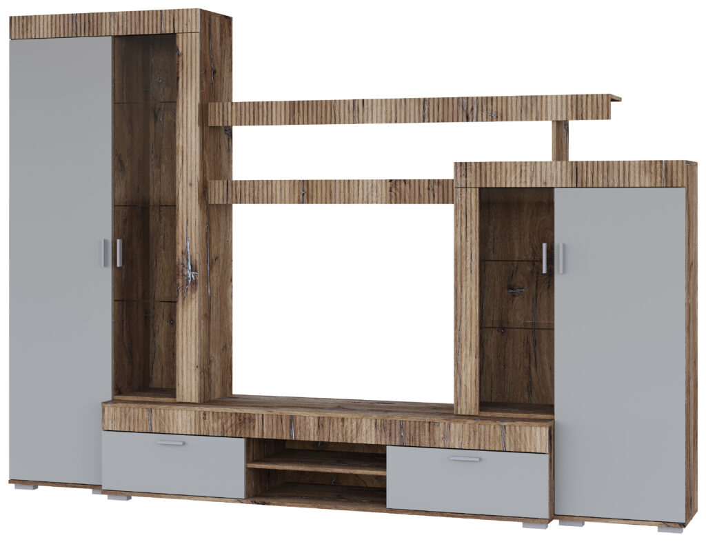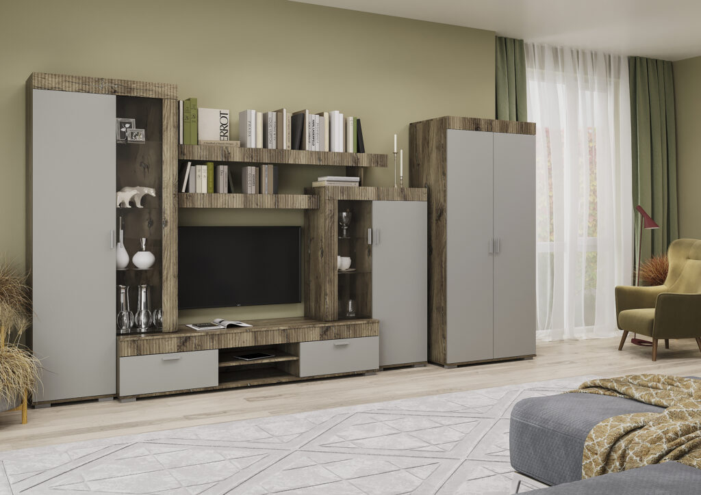 Корпус та фасади даної вітальні виготовлені із ДСП, декоративна планка з МДФ. Дана вітальня виготовлена у трендових кольорах Шиншила сіра/дуб флагшток