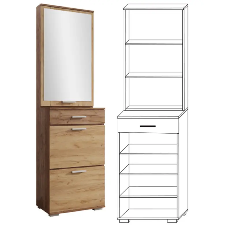 До комплекту модулів Віва входять: велика шафа, полиці та кілька містких тумб, дзеркало з правильною формою. Шафа доповнена висувним вішаком і внутрішньою полицею. Завершують композицію міцні металеві гачки. -