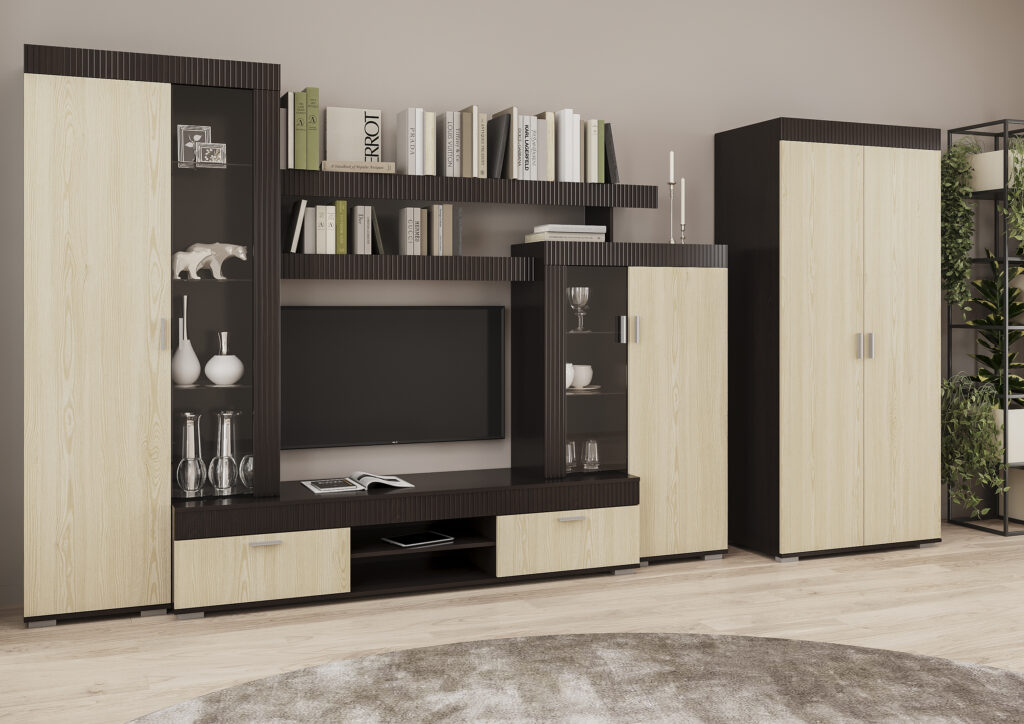Вітальня Марк – це поєднання двох натуральних, класичних декорів «дуб родос» та «венге магія».Декоративні рифлені вставки з МДФ:
